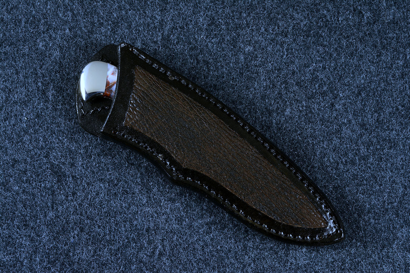"Temno" fine handmade knife in T3 deep cryogenically treated ATS-34 high molybdenum martensitic stainless steel blade, 304 stainless steel bolsters, Bay of Fundy flame agate gemstone handle, shark skin inlaid in leather sheath