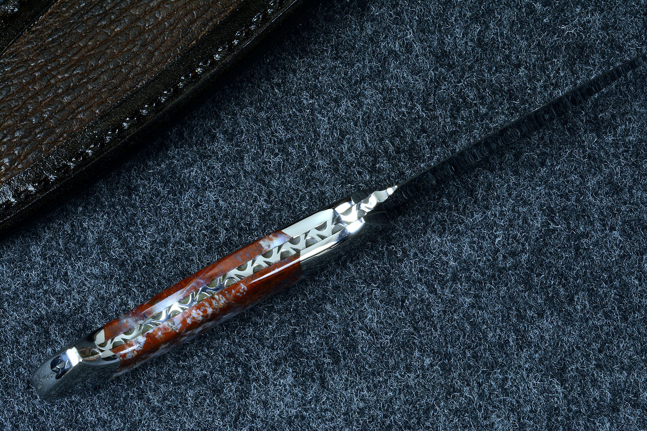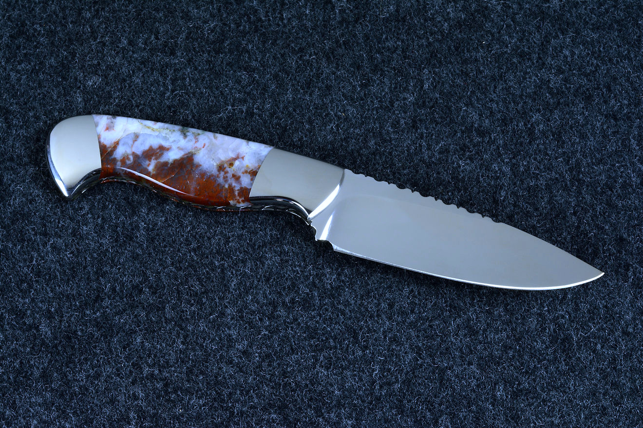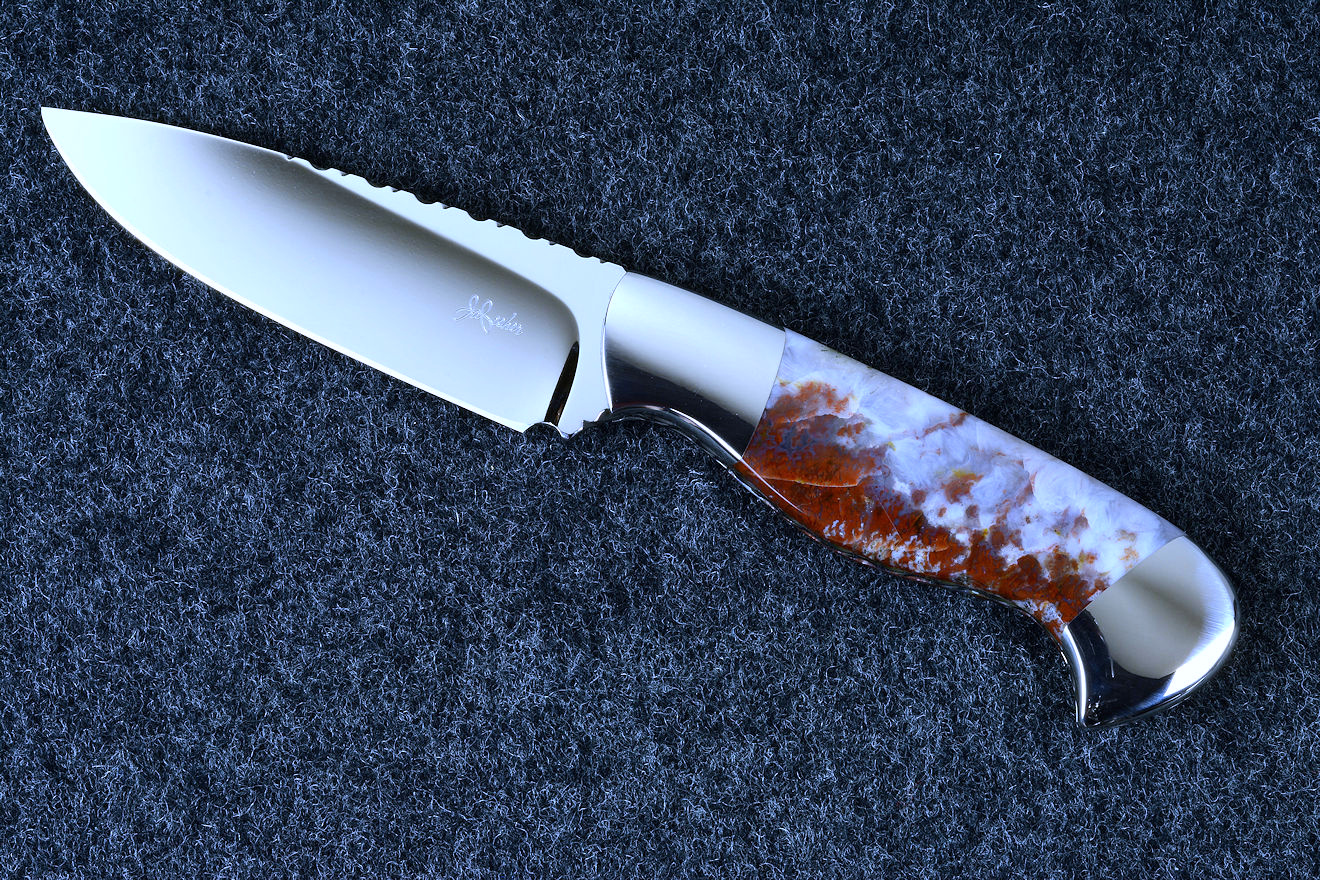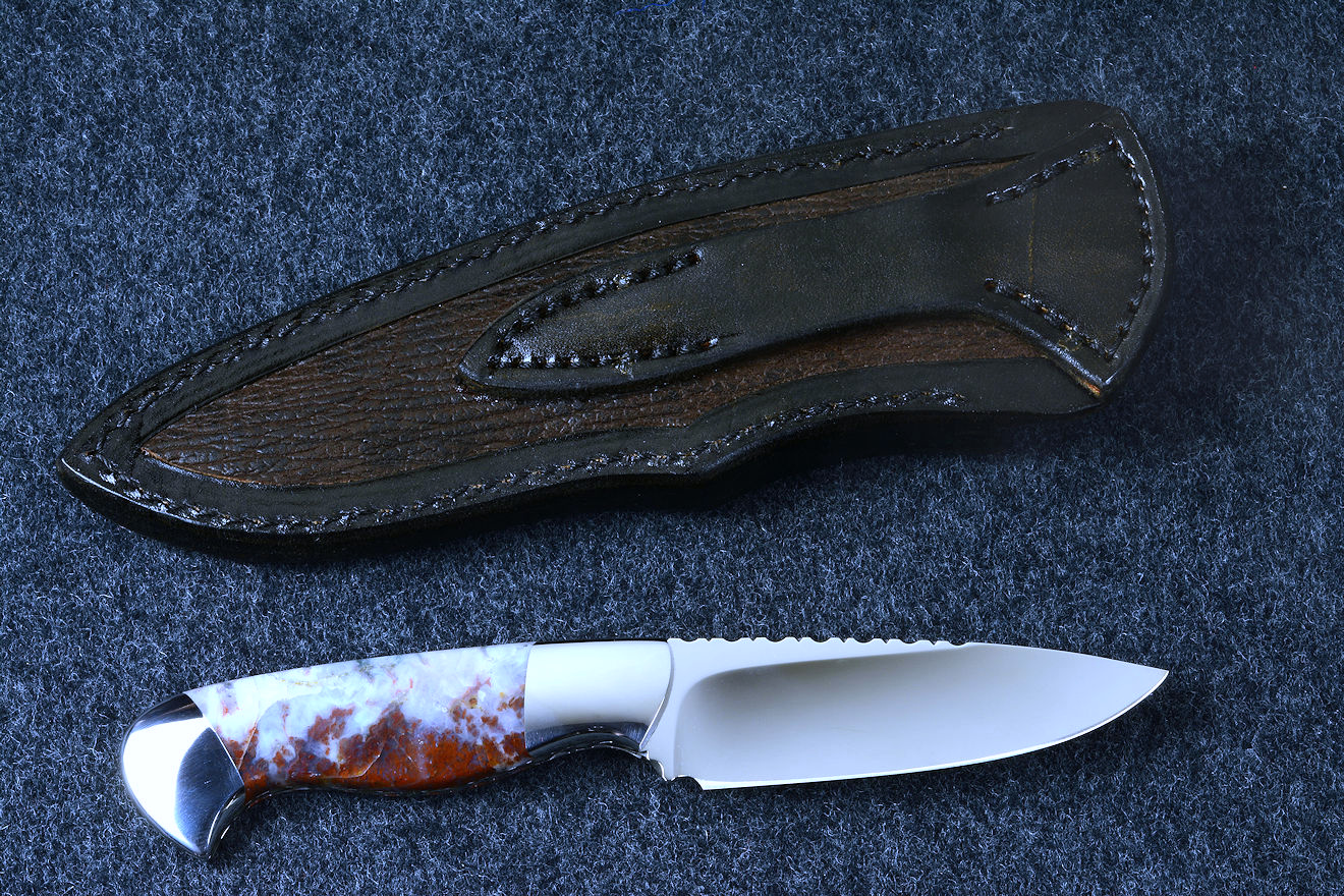 "Temno" fine handmade knife in T3 deep cryogenically treated ATS-34 high molybdenum martensitic stainless steel blade, 304 stainless steel bolsters, Bay of Fundy flame agate gemstone handle, shark skin inlaid in leather sheath "Temno" fine handmade knife, sheathed view in panel inlaid shark skin in 9-10 oz. leather shoulder, nylon thread "Temno" fine handmade knife, reverse side view in T3 deep cryogenically treated ATS-34 high molybdenum martensitic stainless steel blade, 304 stainless steel bolsters, Bay of Fundy flame agate gemstone handle, shark skin inlaid in leather sheath "Temno" fine handmade knife, spine detail view showing full filework, tapered tang and dovetailed gemstone and bolster fittings "Temno" fine handmade knife inside handle detail showing contoured gemstone and bolsters, full filework, fully tapered tang "Temno" obverse side view with maker's mark, in ATS-34 high molybdenum stainless steel blade, 304 stainless steel bolsters, Bay of Fundy flame agate gemstone handle "Temno" obverse side view with maker's mark, in ATS-34 high molybdenum stainless steel blade, 304 stainless steel bolsters, Bay of Fundy flame agate gemstone handle "Temno" reverse side view with maker's mark, in ATS-34 high molybdenum stainless steel blade, 304 stainless steel bolsters, Bay of Fundy flame agate gemstone handle "Temno" reverse side view with maker's mark, in ATS-34 high molybdenum stainless steel blade, 304 stainless steel bolsters, Bay of Fundy flame agate gemstone handle "Temno" reverse side gemstone handle detail, note the flames of carmine red in lavender-tinted white agate and numerous fossil forms in this 6 power enlargement "Temno" obverse side gemstone handle 6X enlargement, note billowing flames of carmine colored agate and white fossil forms in this hard and striking gemstone
